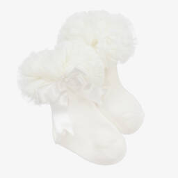 Pretty, ivory cotton-rich ankle socks for little girls by Beau KiD. Soft and stretchy, each has a cute frilly tulle trim and a satin bow.