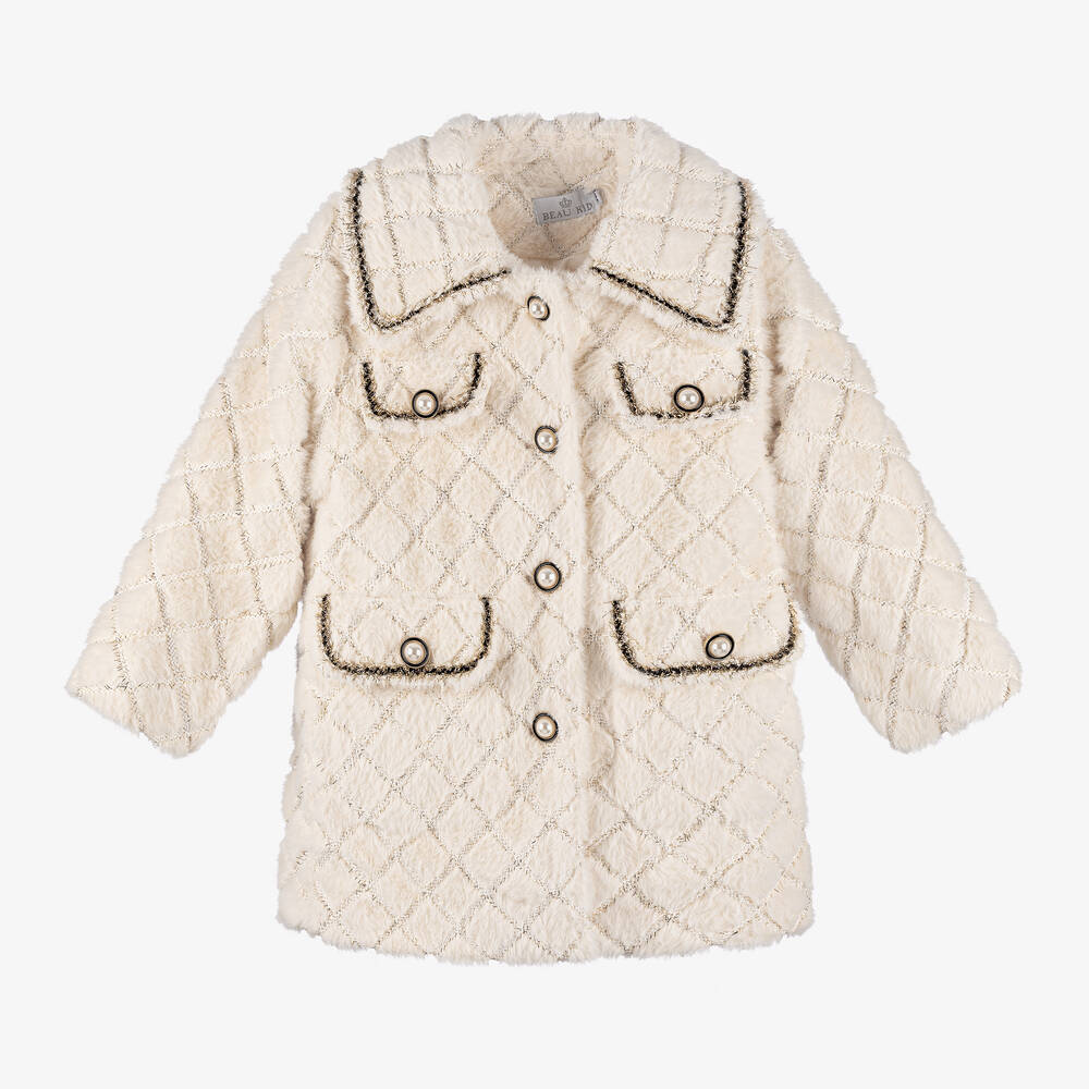 A gorgeous ivory coat for girls by Beau KiD, made in soft and cosy faux fur, with a silky satin lining. Ideal for cooler days, it has a tonal check design, with glittery gold threads adding a lovely touch of sparkle. Fastening with pretty, faux pearl and gold buttons, it is styled with a smart collar, front pockets and faux chest pockets.