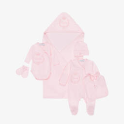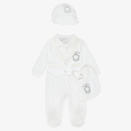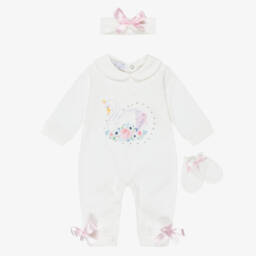 Pretty ivory floral shortie and headband set for baby girls by Beau KiD, made in soft, lightweight cotton. It has an ivory jersey bodice, with an ivory lace trim and pink satin bows. There are popper fastenings on the back and between the legs to help with easy dressing. A matching ivory jersey headband completes the cute set.