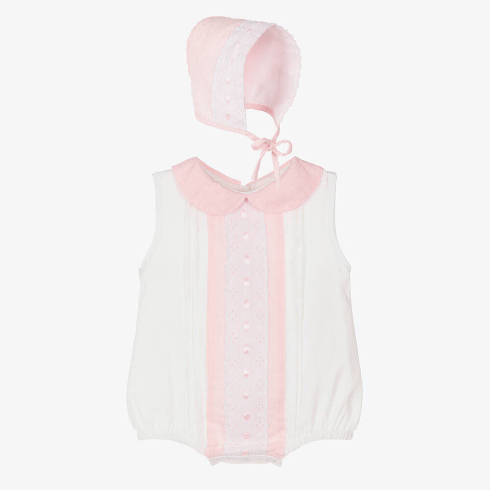 A delightful ivory and pink shortie and bonnet set for baby girls by Beau KiD, made from soft and lightweight cotton. Classically styled with a rounded collar, the pretty shortie has a broderie anglaise and satin ribbon trim on the front. It fastens on the back with pink buttons and has useful poppers between the legs. Completing the traditional look, the bonnet has matching trims and ties to secure under the chin.