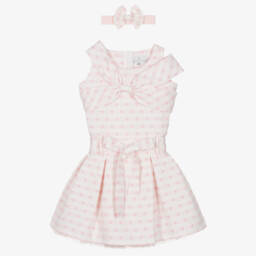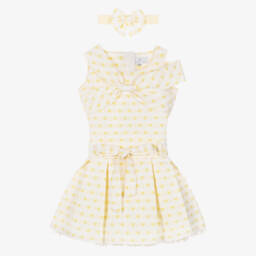 Smart pale yellow skirt set by Beau KiD, ideal for special occasions. Softly textured with a subtle sheen, the set is patterned with pretty yellow jacquard hearts, with large, eye-catching, appliqué bows on all pieces. The pleated skirt has a tulle underskirt for added volume and a concealed side zip for a neat finish. A matching bow hairband completes the look.