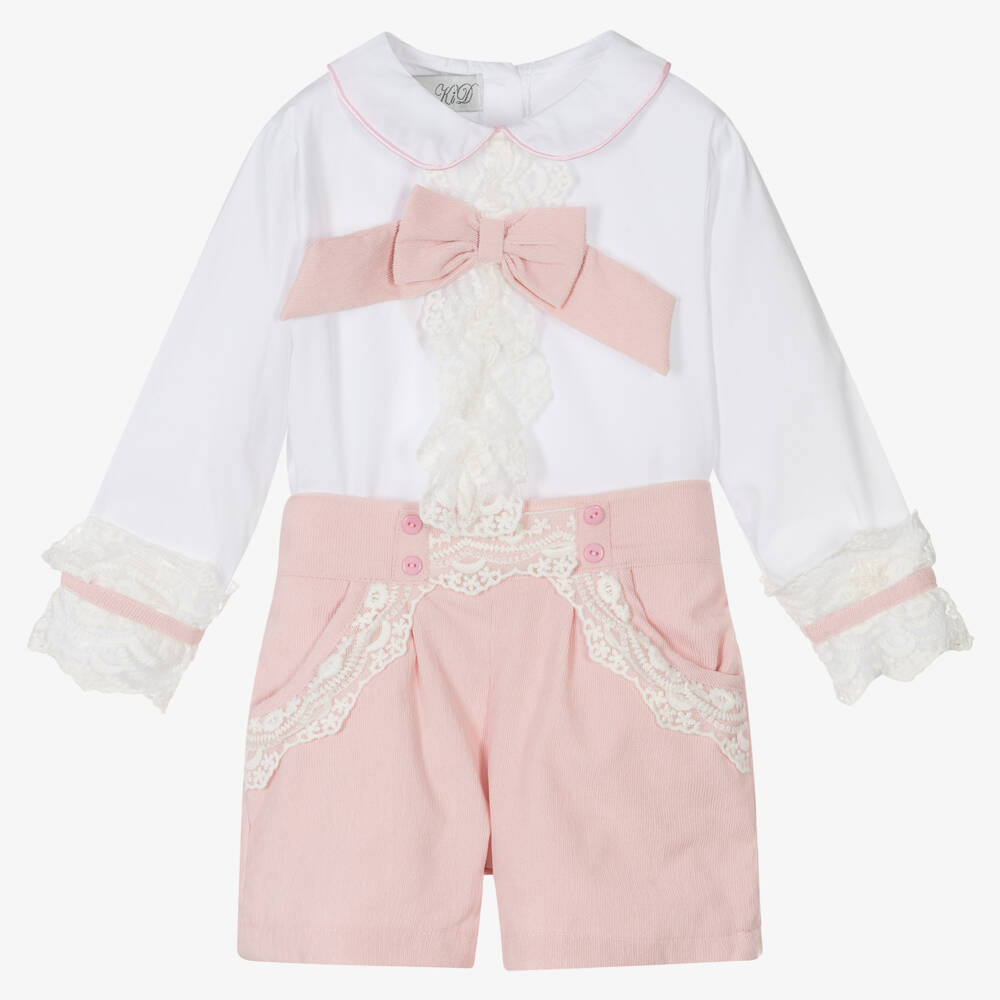 Pretty and feminine for girls, this traditionally styled shorts set is by Beau KiD. Made in fine corduroy with a lightweight cotton voile lining, the pale pink shorts have a comfortable elasticated waist and a side zip fastening. The front is trimmed in beautiful white lace and has faux button detailing. Woven in smooth cotton poplin with back button fastenings, the white blouse has matching lace trims and a stand-out corduroy bow.
