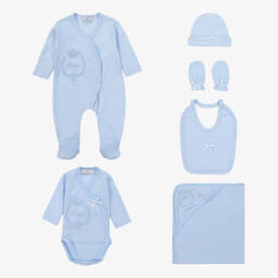 Pink six-piece babysuit set for girls by Beau KiD. Made in soft cotton jersey, the set consists of a hooded blanket, babygrow, bodysuit, mittens, hat and a bib. The blanket, babygrow and bodysuit each have an embroidered 'Princess' logo crest, while the bib, hat and mittens have a sweet ribbon bow detail.