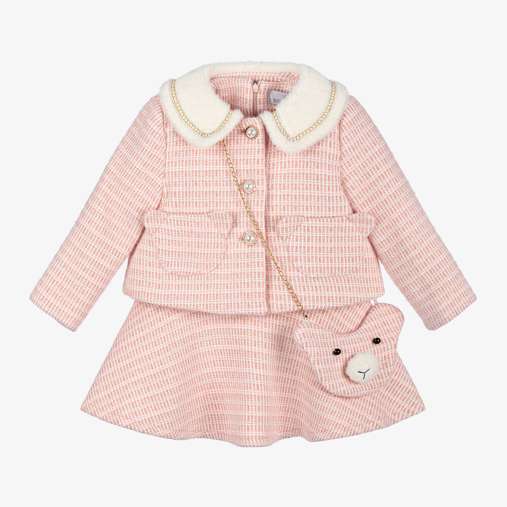 Elegant pink dress, jacket and bag set for girls by Beau KiD, in a beautifully soft, fluffy weave with an ivory geometric pattern. The sleeveless fit and flare dress has a silky lining and a concealed zip fastening. It pairs with a chic jacket that has a beautiful ivory faux fur collar and gold chain embroidery. Fastening with pearl and diamanté buttons, it has charming teddy bear pockets to match the cute little shoulder bag.