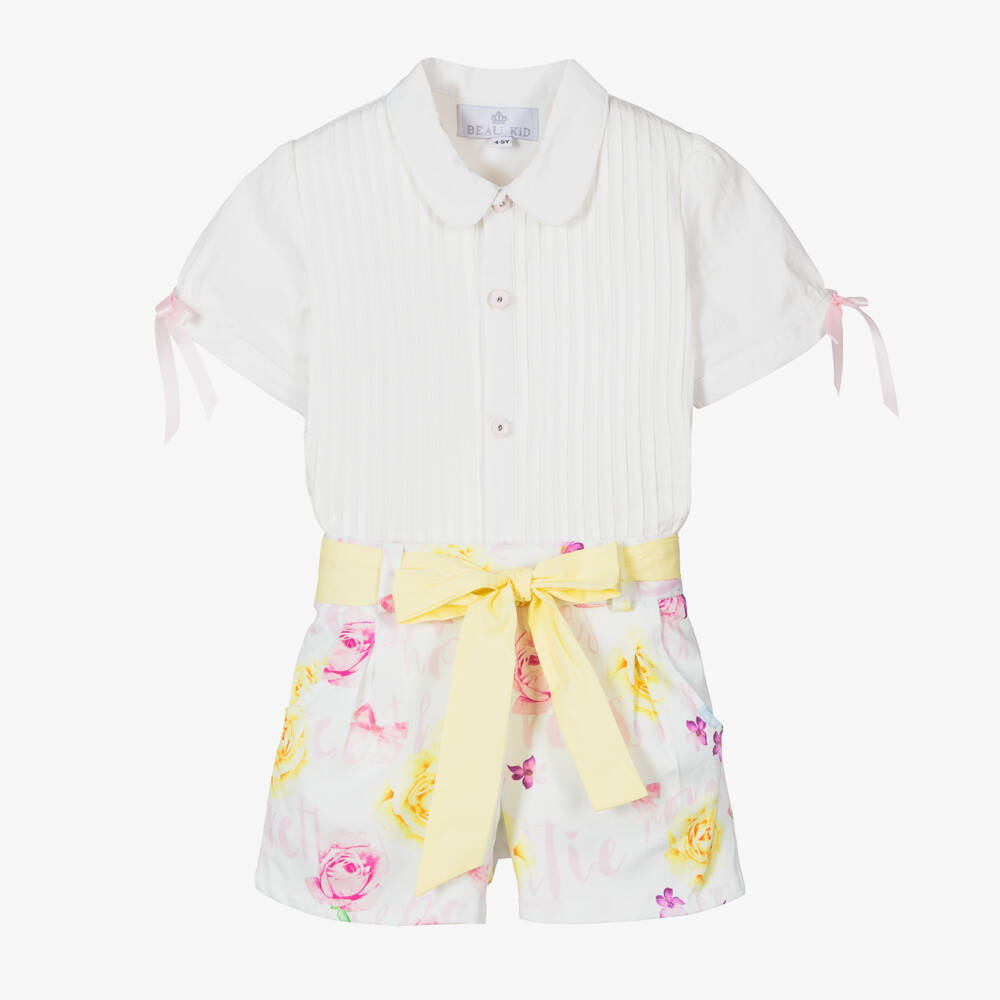 White cotton blouse and shorts set for girls by Beau KiD, with a lovely floral print in pink and yellow. The blouse has smart pintucking on the front, with pretty pink satin bows on the puffed sleeves and sparkly diamanté button fastenings down the front. The shorts are gently elasticated around the back, have a side fastening a detachable yellow sash belt.