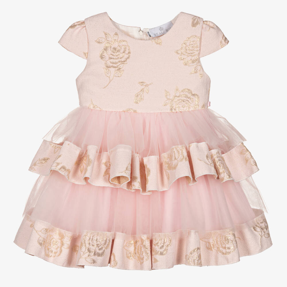 Stunning pink special occasions dress for girls by Beau KiD, made in soft jacquard and tulle. The bodice has beautiful gold flower details for a touch of glamour, whilst the layers of tulle on the skirt create dramatic volume for an eye-catching finish. The capped sleeves and large bow on the back add to the femininity of this pretty dress. It fastens on the back with a concealed zip for easy dressing.
