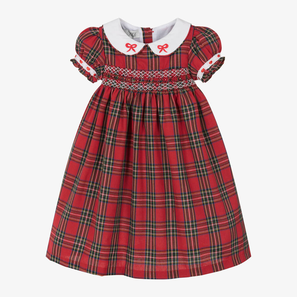 Traditionally styled red tartan dress for girls by Beau KiD, made in soft cotton twill. This pretty dress has short, puffed sleeves, trimmed with red and white ribbon and lace, and a white Peter Pan collar with embroidered red bows. Fully lined for comfort, it has a classic smocked panel on the front with red floral embroidery. It fastens on the back with buttons and a sash tied into a bow.