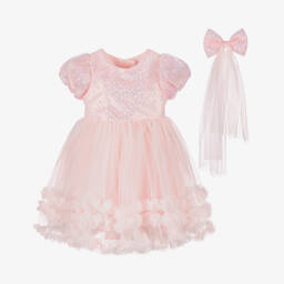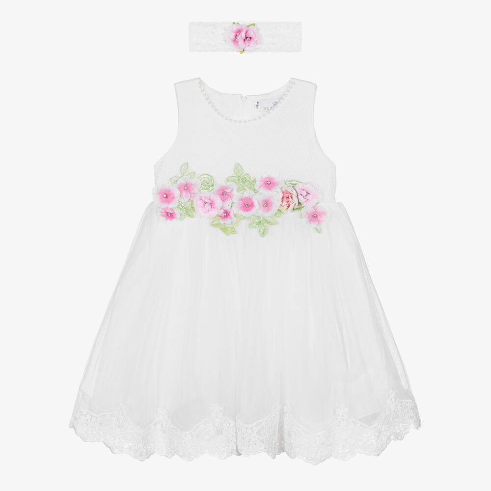 A special occasion white dress and headband set for girls from Beau KiD. The bodice is made in pretty soft mesh with an elegant pearl trim around the neck. For an eye-catching look, the skirt has gathered layers of voluminous tulle, trimmed with lace and decorated with fabric flowers, leaves and sparkling diamanté. There is a beautiful removable flower and tulle bow brooch on the back and a matching stretchy lace headband.