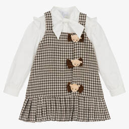 A gorgeous yellow dress set for girls by Beau KiD, woven in a tweed-effect fabric and lined in soft cotton. This classic style has a floral embroidered white collar and pretty ruffle trims. It has a full, box pleated skirt, with underlayers of silky satin and soft tulle creating extra volume. The dress fastens on the back with a zip and sash tie and comes with a matching shoulder bag.