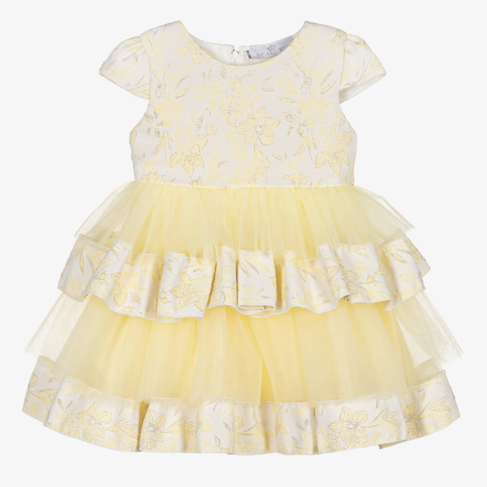 Stunning yellow special occasions dress for girls by Beau KiD, made in soft jacquard and tulle. The bodice has beautiful gold flower details for a touch of glamour, whilst the layers of tulle on the skirt create dramatic volume for an eye-catching finish. The capped sleeves and large bow on the back add to the femininity of this pretty dress. It fastens on the back with a concealed zip for easy dressing.