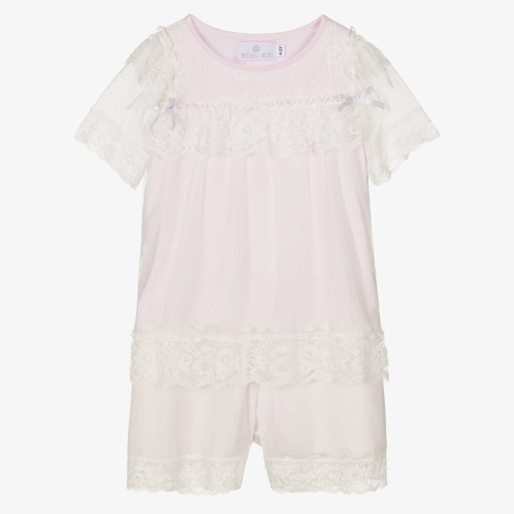 In a lovely shade of lilac pink, these pretty short pyjamas for girls are by Beau KiD. Made in soft and comfortable jersey, both pieces have fine mesh overlays, with delicate lace trims. The top is decorated with satin ribbon bows on the front, and shorts have a comfortable elasticated waistband.