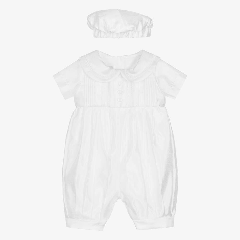 White special occasion shortie set for baby boys by British brand Beau KiD. Made in lightweight slub satin with a sheen, the bodice has pretty pintucks, ladder stitch embroidery and decorative buttons. The lower part is pleated and full. The shortie comes with a cute traditionally styled hat with an elasticated brim.