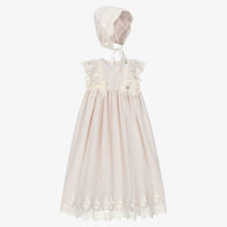 Baby boys and girls white ceremony gown and bonnet set from Beau KiD. The gown has a smocked bodice, with delicate beading details. The long skirt is made in lightweight layers of satin and organza with fine stitching trim on the hemline. The matching lace bonnet ties under the chin.