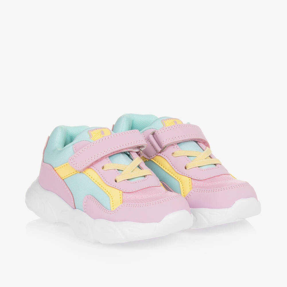 Lilac purple and turquoise blue trainers for girls by Beppi, designed with contrasting knit, mesh and synthetic uppers. Super lightweight, these colourblock trainers have elasticated yellow laces and an adjustable velcro strap to tighten or loosen the fit. Rubberised branding can be seen on the tongue. The heel collar is gently cushioned and the soft foam insole provides additional comfort with every step. They have a flexible Phylon outsole with shock-absorption.