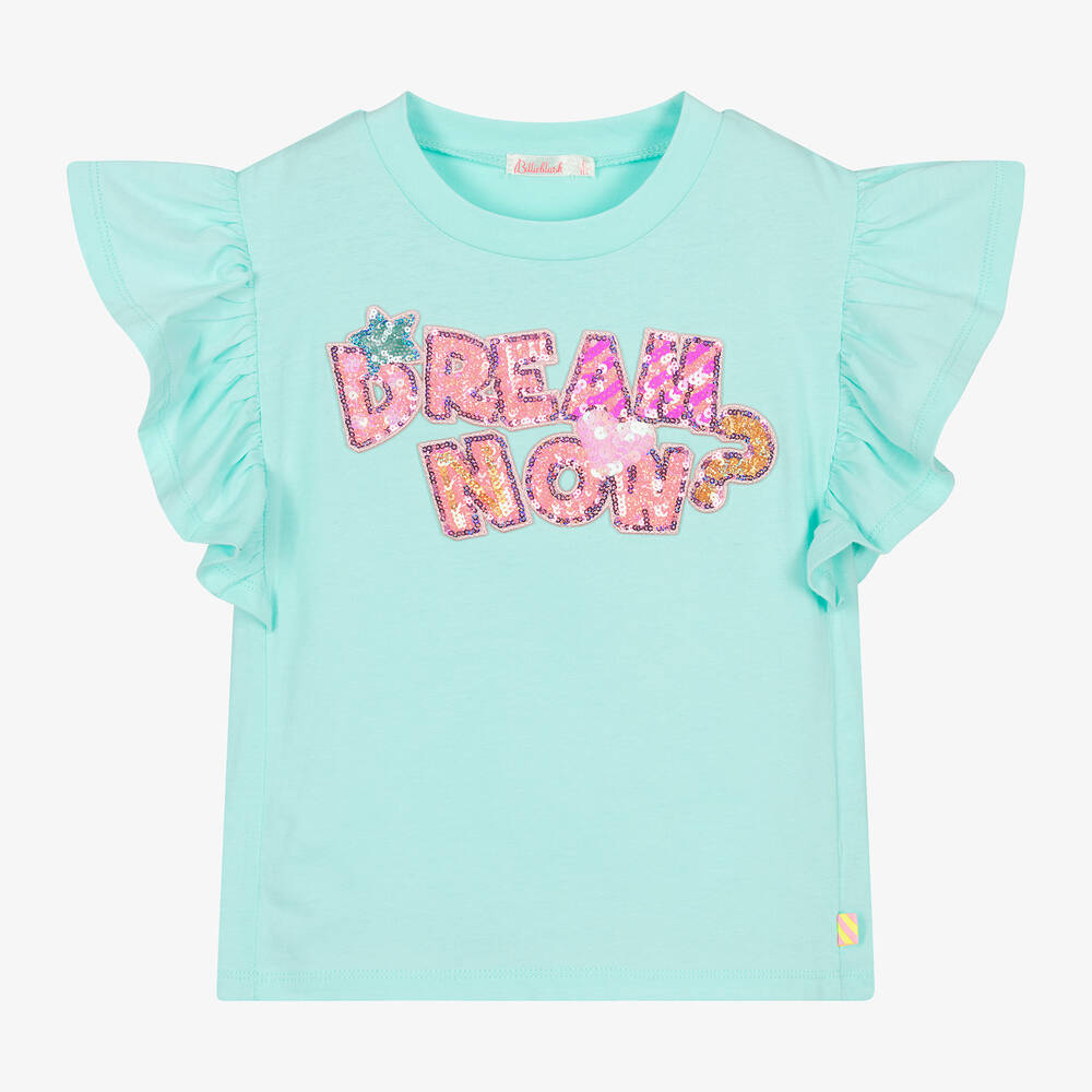 Pretty aqua blue T-shirt for girls by Billieblush, made in soft organic cotton jersey with flutter short sleeves. Adding the brand's signature touch of neon, there is a bright pink slogan, 'Dream Now', across the front in sparkly sequins.