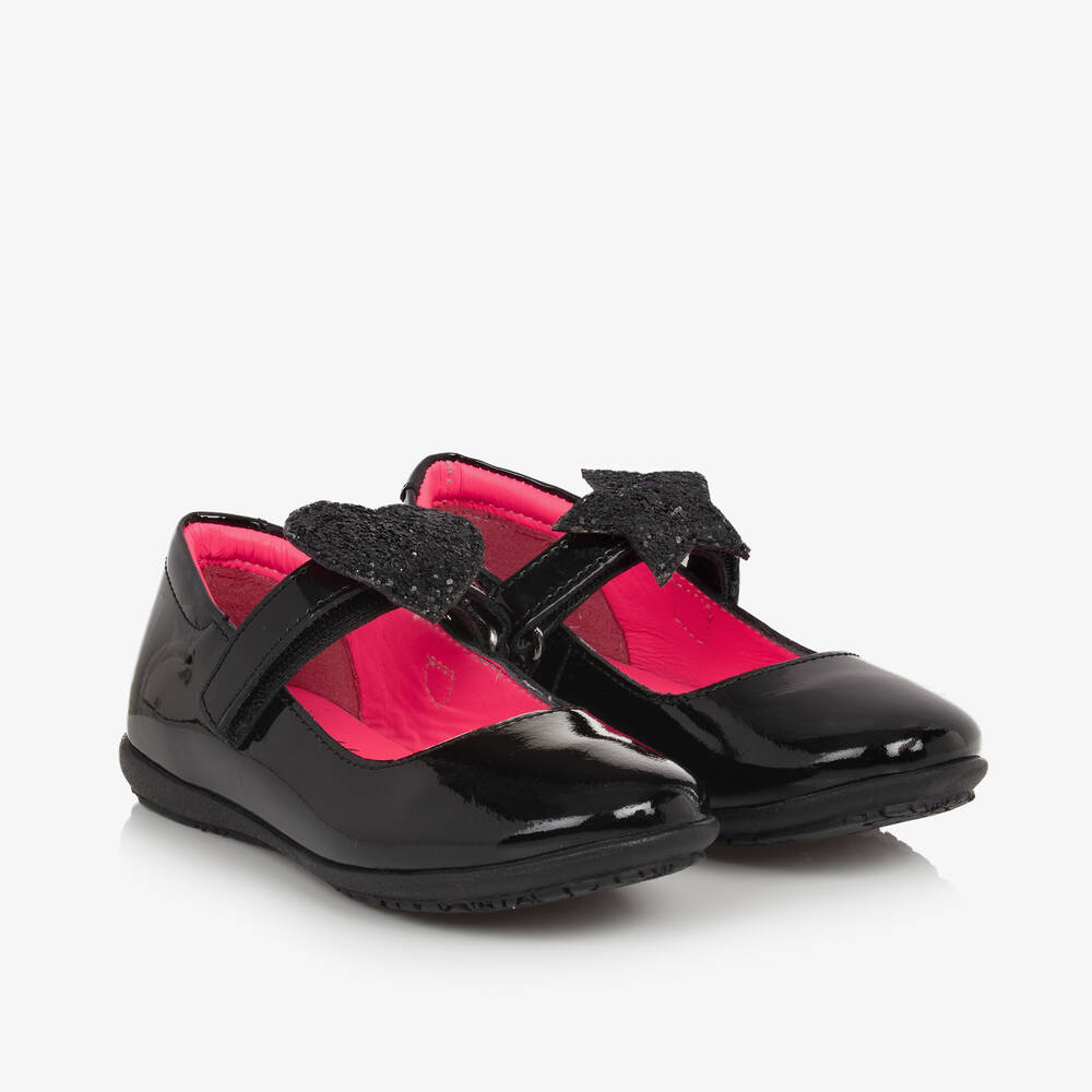Classic black patent leather bar shoes for girls by Billieblush, with detachable glittery heart and star patches. Versatile for both fun everyday wear and school, the decoration can be easily threaded through the velcro fastening straps for an alternative look. The brand's signature neon pink leather full lining adds comfort and the rubber outsole improves grip on the go.