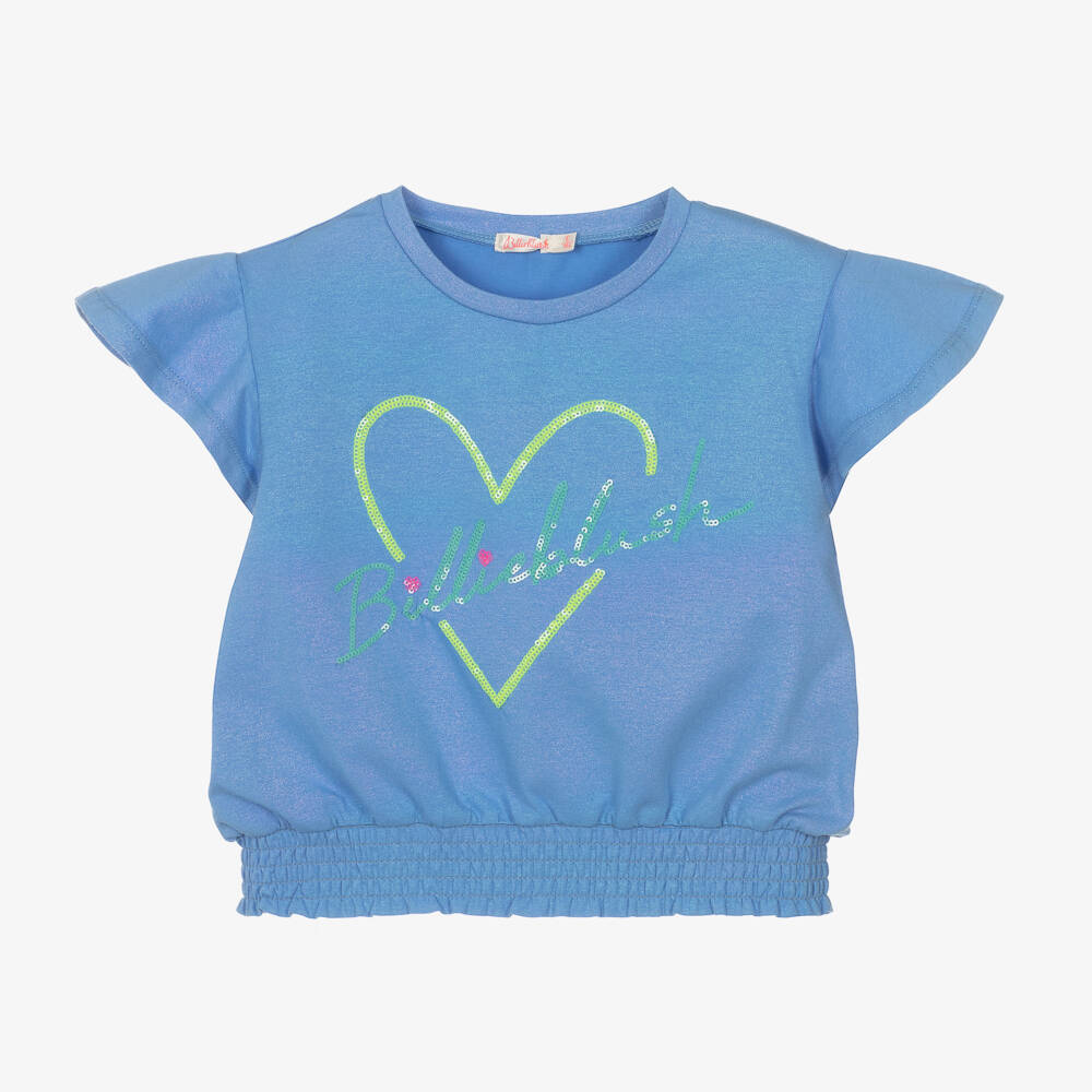 Blue cotton T-shirt for girls by Billieblush, made in soft, comfortable jersey with an iridescent shimmer. It has a bold green logo and a yellow heart on the front, pretty angel sleeves and the brand's signature tab on one side. It has an elasticated waistband for an effortlessly stylish silhouette.