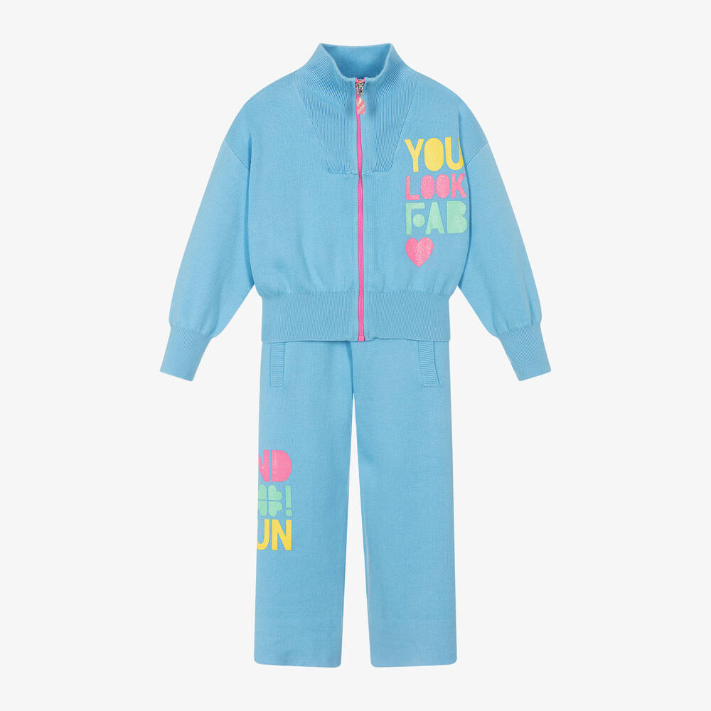 Blue tracksuit for girls by Billieblush, knitted in a soft cotton and viscose blend. Ideal for loungewear, this cosy tracksuit has wide knitted trims and neon pink and gold logo tabs. Both pieces feature colourful, glittery uplifiting slogans. The top has a neon pink zip fastening and the wide-leg trousers have front pockets and a wide, elasticated waistband for a comfortable fit.