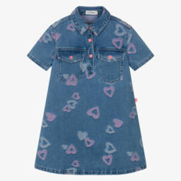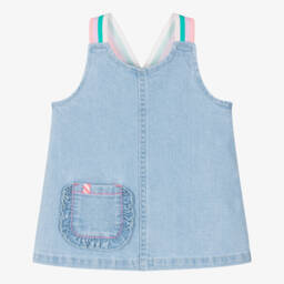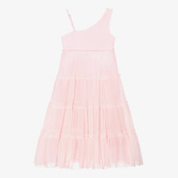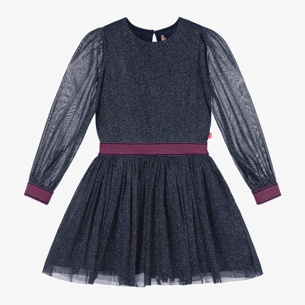 Girls navy blue glittery tulle dress by Billieblush with contrasting pink elasticated trims. Ideal for a special occasion, this long-sleeved party dress has a soft viscose lining for added comfort and fastens with a single button on the back. There are layers of soft tulle and net underneath for added volume and a small branded tab on one side adds a discreet designer finish.
