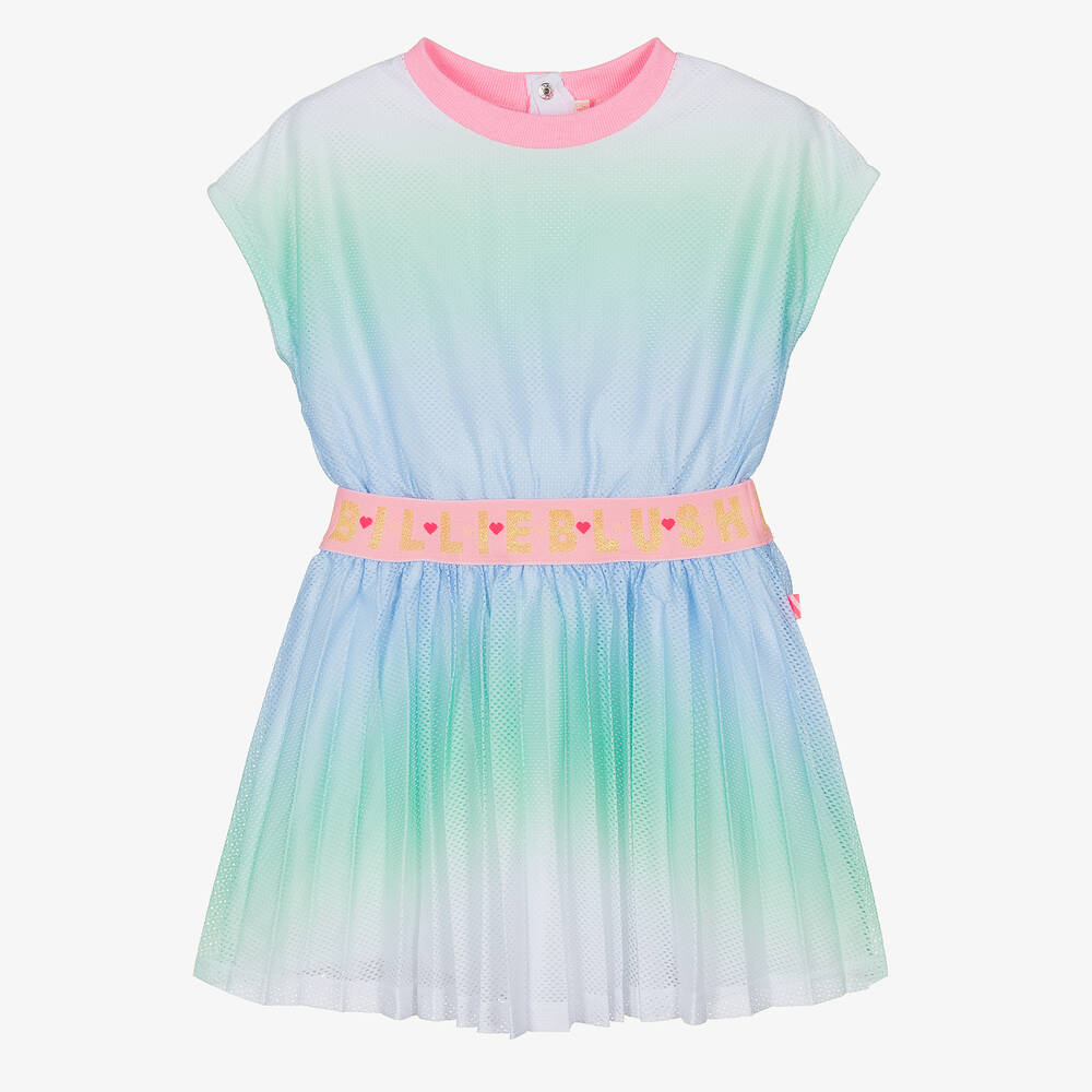A green and blue gradient-effect dress for girls, by Billieblush. Made in breathable mesh for a sporty vibe, this dress has a pink crew neck with a pleated skirt. The elasticated logo waistband and glittery popper fastening on the back offer playfulness, whilst remaining practical. It has a silky soft viscose lining for ultimate comfort.