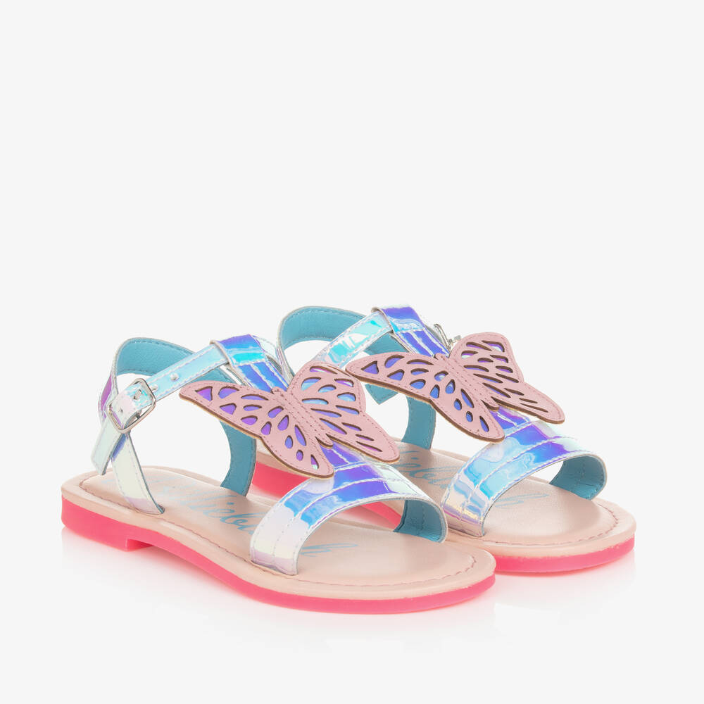 Super pretty blue and pink sandals for girls by Billieblush, made from iridescent patent faux leather. Decorated with a delightful appliqué butterfly on the front, they fasten neatly with buckles on the sides. Lined in soft leather with a gently padded insole, they have neon-pink rubber outsoles for a vibrant finish.
