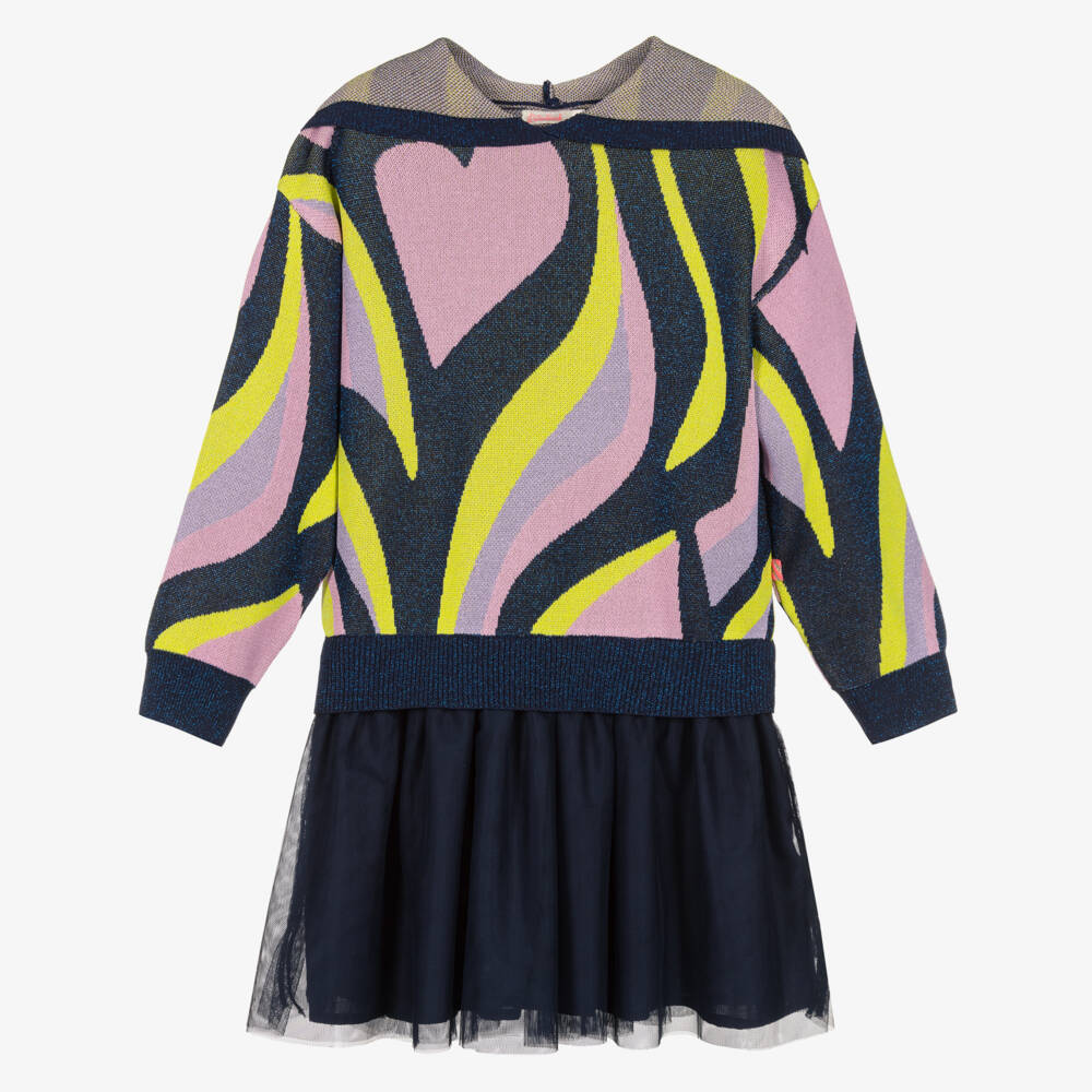 Fun and playful for girls, this navy blue hooded dress is by Billieblush. The upper part is finely knitted in a yellow, pink and purple heart pattern, with a touch of glittery sparkle. The skirt is made in a double layer of soft mesh and lined in lightweight viscose for comfort. For quick and easy dressing, this casual dress simply pulls on over the head. A signature striped tab on the side adds a subtle touch of branding.