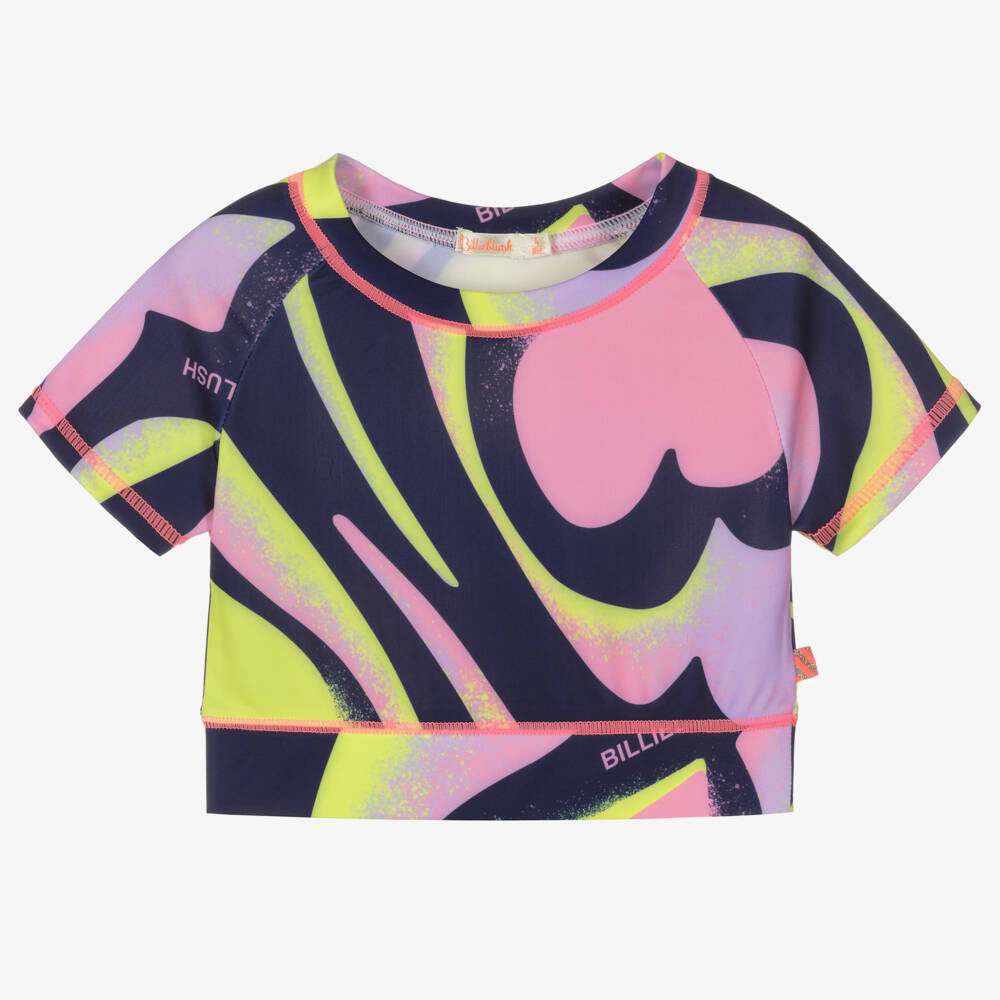 Sporty navy blue T-shirt for girls by Billieblush, with a fun and playful yellow, pink and purple heart pattern. Silky soft and stretchy, it is designed in a cropped fit with an elasticated hemline for a comfortable fit. Adding a touch of branding, there is a subtle logo print within the pattern and a signature striped tab sewn on one side seam.
