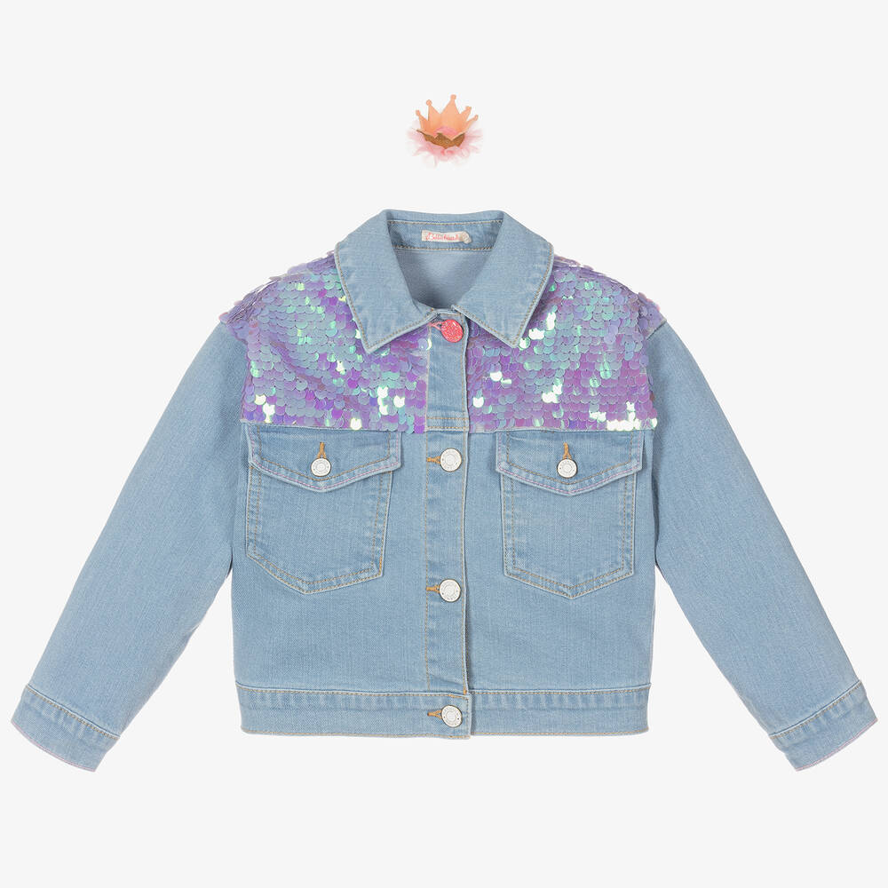 A fun blue denim jacket for girls by Billieblush, made from soft and stretchy cotton. Part of the Happy Birthday collection, it has iridescent sequins decorated on the shoulders to add sparkle to their look. A glittery neon pink button secures beneath the collar, with additional fastenings and button-up chest pockets. It comes with a gold crown hair clip to accessorise their outfit.