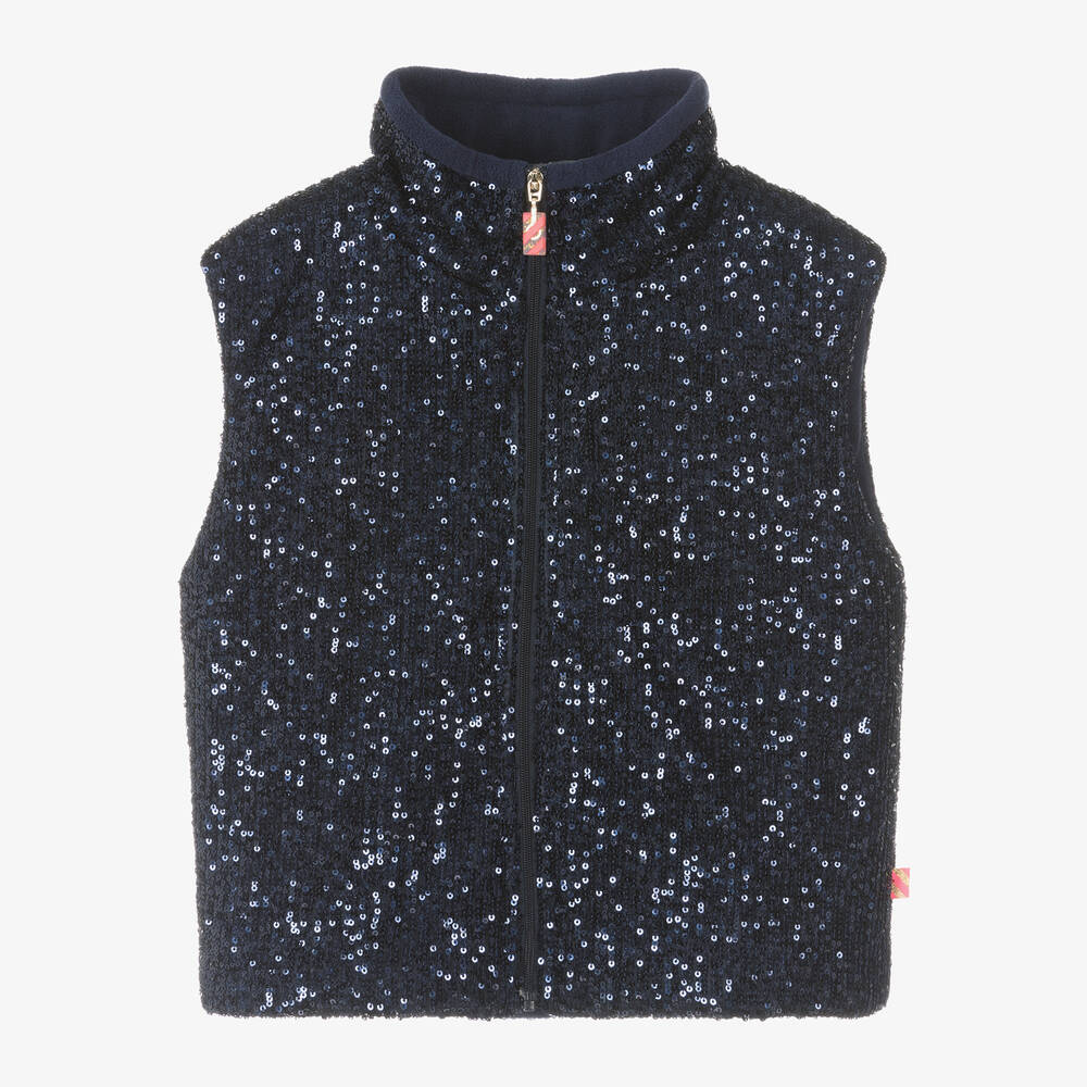 Ideal for elevating her cosy casual wardrobe, this navy blue Billieblush gilet for girls is covered in sparkly sequins. It has a bold appliqué design on the back featuring the words, 'All you need is magic' in pink, purple and orange bouclé letters. It is softly padded and has a high neck and comfortable polar fleece lining. The front zip fastening has a branded pull to match the logo tab on the side seam.