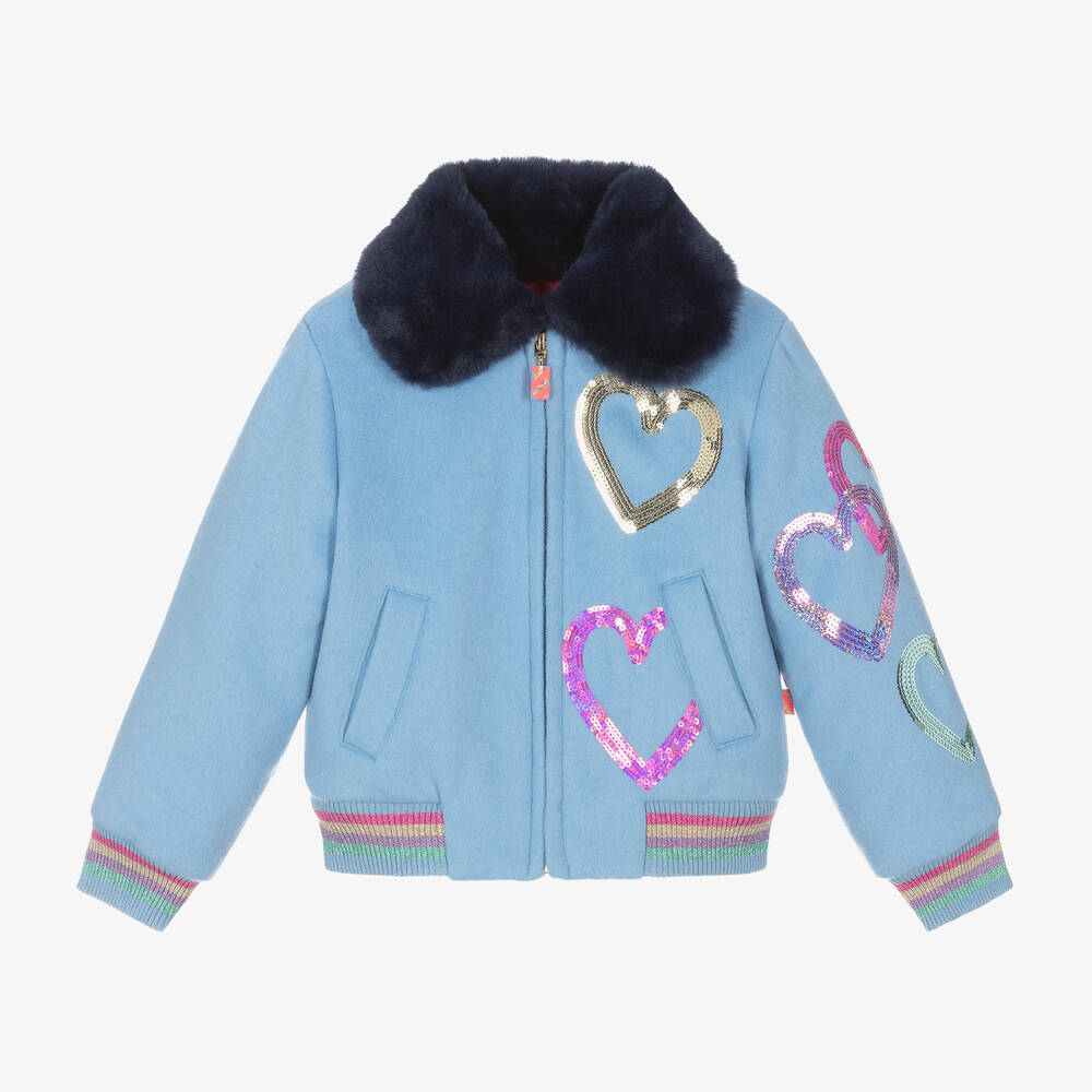 Dusky blue jacket for girls by Billieblush, made in a felted wool blend with mid-weight padding for warm layering. This fashion-forward jacket is designed with oversized sequin hearts in shades of pink, gold and green. It has a beautifully soft faux fur collar in navy blue and a full zip fastening on the front which reveals a neon pink, quilted lining when open. Front pockets are positioned to keep hands warm, while the ribbed cuffs and hem are detailed with glittery, metallic stripes for an extra Billieblush touch.