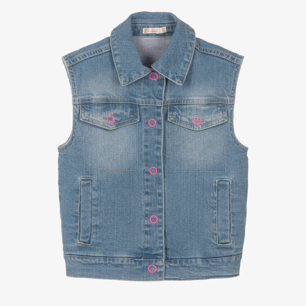 Dare to stand-out in this blue sleeveless jacket for girls by Billieblush, made in soft, stretchy cotton denim. It has neon pink popper fastenings down the front, with decorative and functional pockets for a cool, edgy look. There is a colourful crocheted heart and an elasticated waistband on the back, with a fun, glittery rubberised logo.
