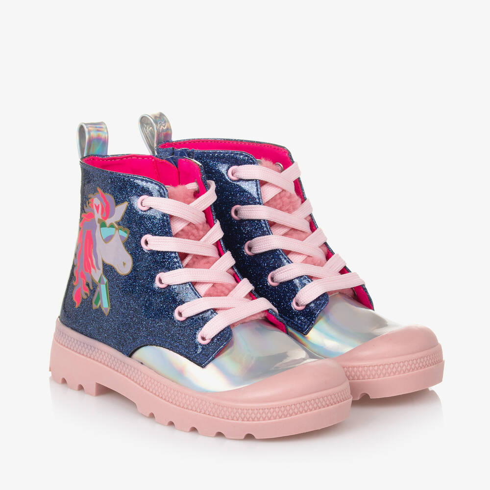 Blue high-top trainers for girls by Billieblush, with a cute neon pink unicorn stamped on the side. These playful trainers combine glitter, metallic chrome and teddy fleece for a fun look. They fasten easily with a zip on the side and have pink laces on the front. The textile lining and insole are designed in the brand's iconic neon pink shade, and the chunky pink outer sole has deep treads for style and grip.