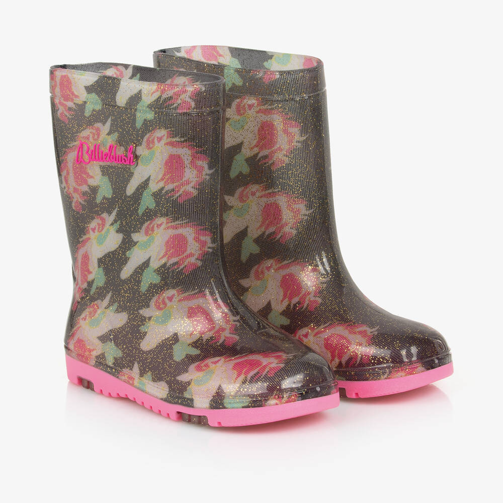 Fun, glittery navy blue rain boots for girls by Billieblush, patterned with pink, white and green unicorns. Smooth and sturdy, they have a soft textile lining and a soft, padded, removable insole for comfort. Ideal for keeping little feet dry whatever the weather, they have a non-slip pink sole for a good grip. A bright pink logo on the sides adds a finishing designer touch.