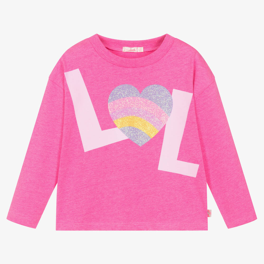 Bright pink marl long-sleeved top for girls by Billieblush, made from a soft, comfortable jersey. It has a large 'LOL' slogan across the front featuring a pretty multi-coloured sparkly heart. This top has a boxy fit and a ribbed crew neckline for a fun, casual look.