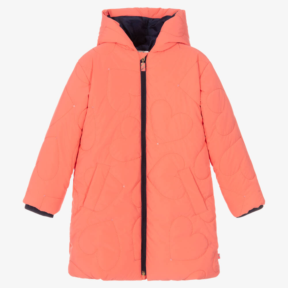 Coral pink coat for girls by Billieblush. Made in smooth polyester, the fabric is quilted in love heart shapes each finished with a single sequin adding a sparkle to the coat. Warmly padded, it has a silky lining, front pockets and glittery navy blue ribbed cuffs to keep the warmth in. It fastens at the front with a navy blue zip.