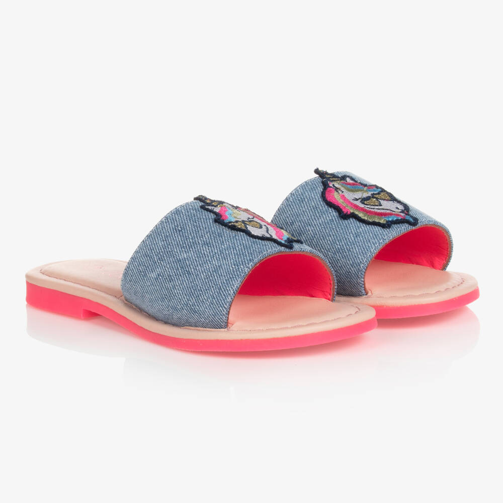 A denim pair of sliders for girls, from Billieblush. Pretty and playful, they are topped with colourful glittery unicorn patches. Lightweight for warmer weather wear, they have a soft leather insole. The neon pink outer sole is non-slip, offering secure and comfortable wear.