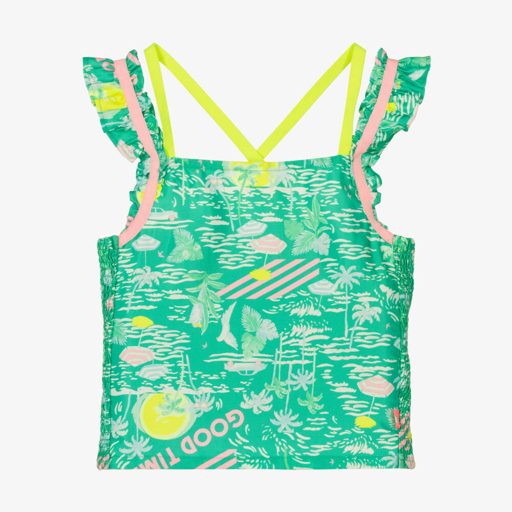 Fun green camisole top for girls by designer Billieblush, made in a soft and silky sateen. Patterned in a summery palm tree design with 'Good Time' printed all-over, it has pretty frilled straps with pink and yellow contrast tapes, which cross-over at the back. It has intricate shirring on the back for a comfortable fit.