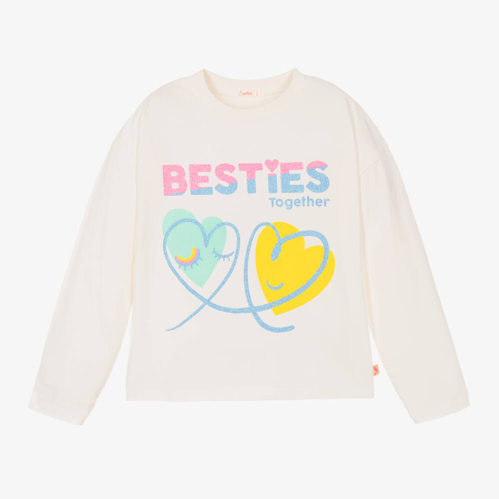 Girls ivory cotton long-sleeved top by French designer Billieblush, made in soft and comfortable jersey. Lightweight, it has a sweet 'besties' print in glittery shades of pink and blue on the front, with a lightly ribbed crew neckline.