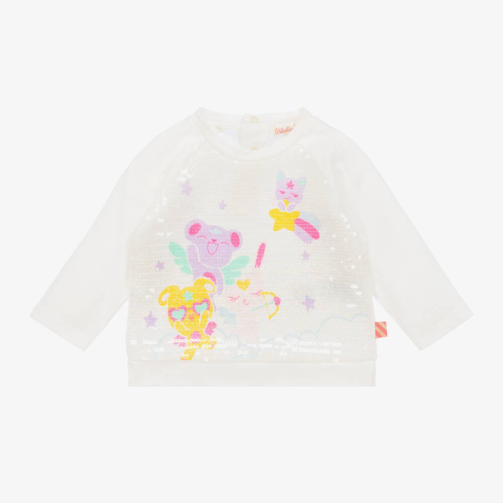 Ivory cotton top for little girls from Billieblush, made in super-soft jersey. Full of character, it has a fun print of cartoon-style teddy bears, cats, stars and clouds. Iridescent sequins decorate the front for added shimmer and sparkle. It fastens with poppers on the back to help with dressing.