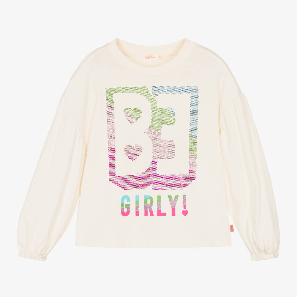 Fun for girls, this ivory cotton long-sleeved top is by Billieblush. Sparkly and colourful, the oversized 'BE Girly!' slogan in stick-on rhinestones and glittery prints can be seen on the front. Soft and stretchy jersey, this comfy top has a ribbed neckline and elasticated cuffs on the relaxed puffed sleeves.