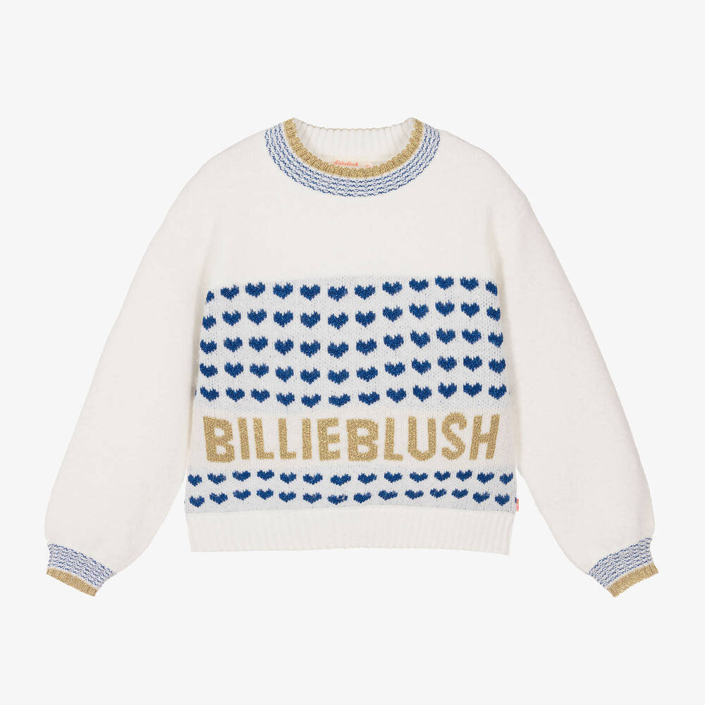 A fun ivory sweater for girls by Billieblush, in a super soft and cosy knit. It is patterned with glittery blue hearts and the brand's sparkly gold logo on the front, with coordinating trims around the ribbed neckline and cuffs.