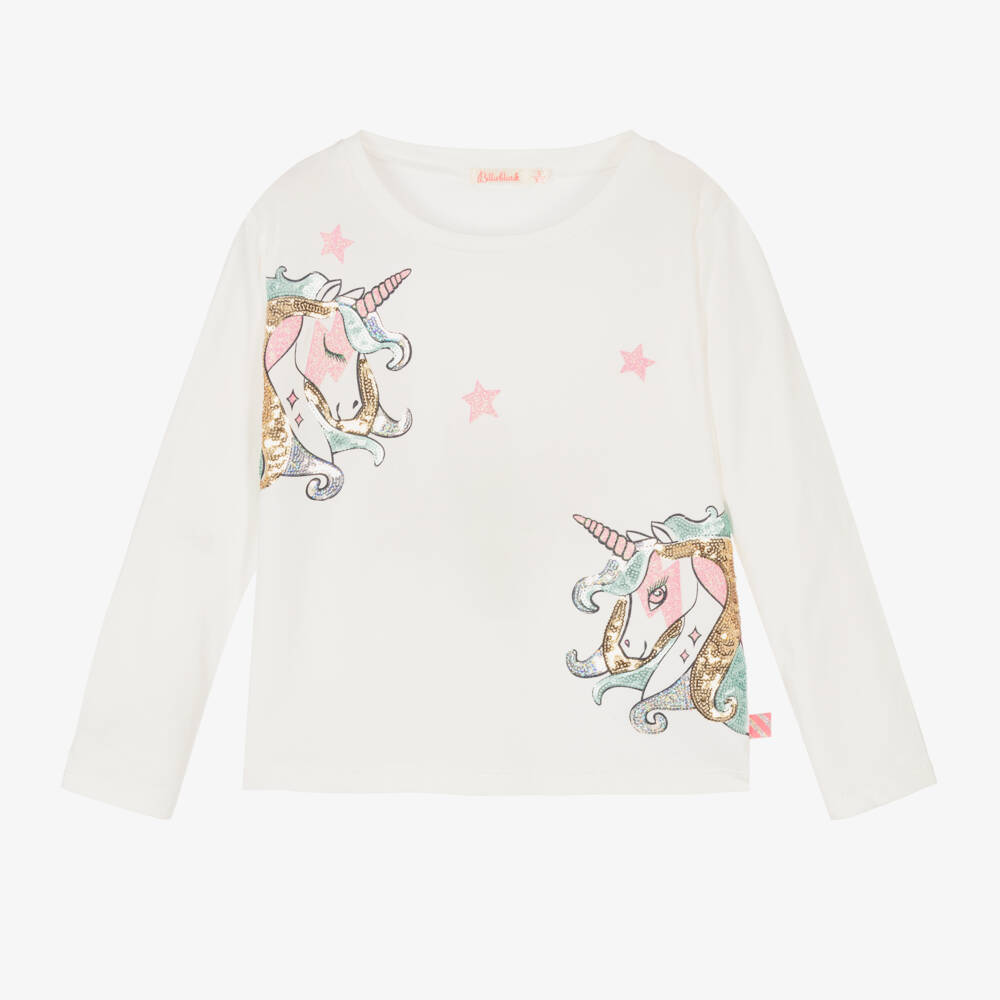 Pretty ivory cotton top for girls by Billieblush, shimmering with sequinned unicorns in pink, blue and gold. With glittery pink detailing and iridescent stitching, it is made in comfortable jersey for all-day fun.