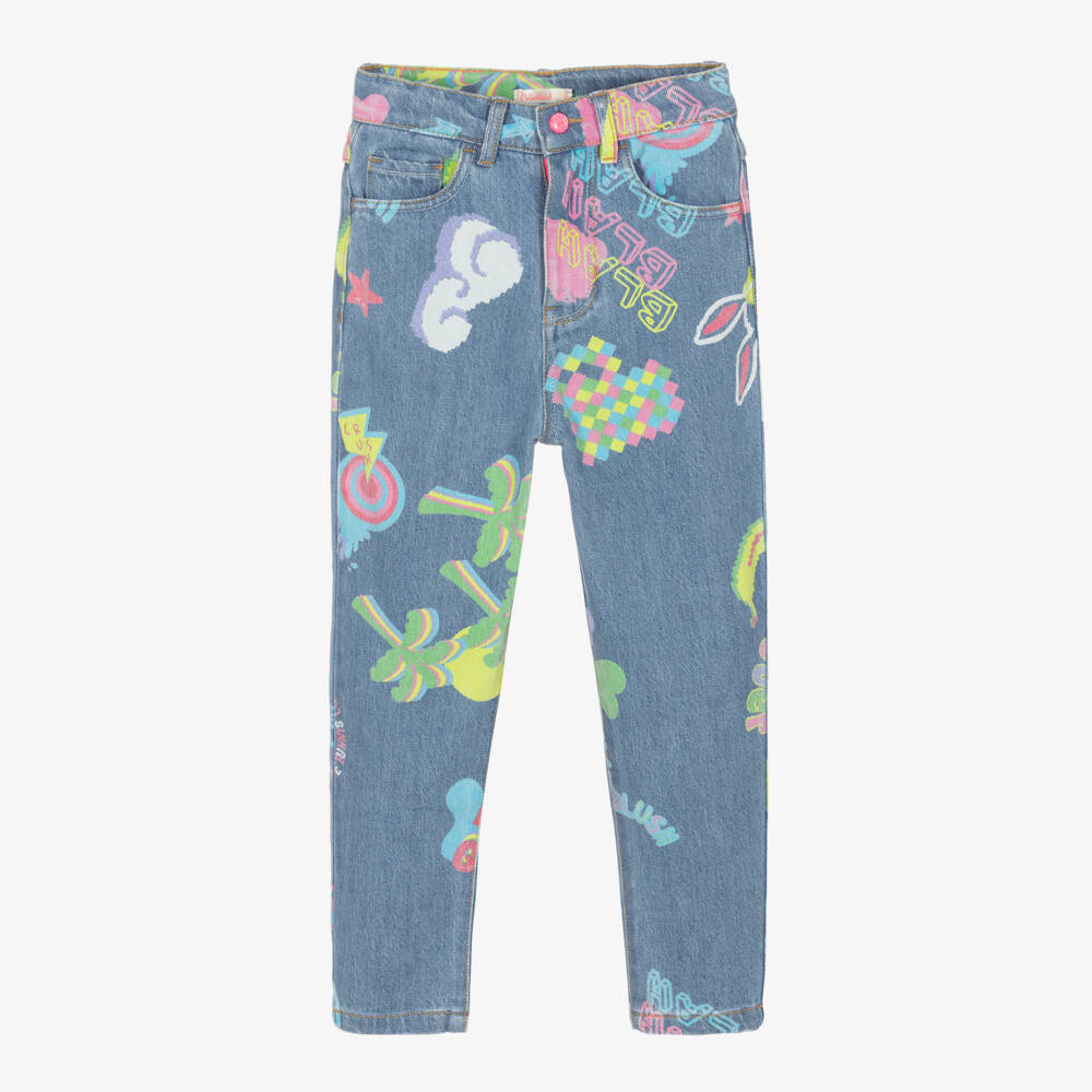 Light blue cotton denim jeans for girls from Billieblush, with a fun and colourful all-over print. High-waisted with a tapered loose-fit, they have a neon pink and glittery gold striped silicone logo patch on the back for a branded signature look. They fasten with a pink zip and glittery popper on the adjustable waist.