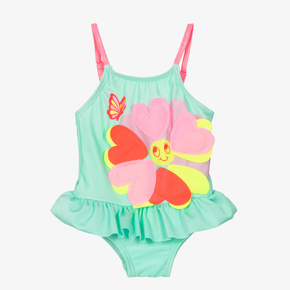 Sweet mint green swimsuit for little girls by Billieblush, decorated with a cute flower on the front and colourful, 3D petals. It has a frilled trim around the waist and adjustable, neon pink straps for a girly look. Silky and stretchy, it adds a touch of playfulness to poolside fun.