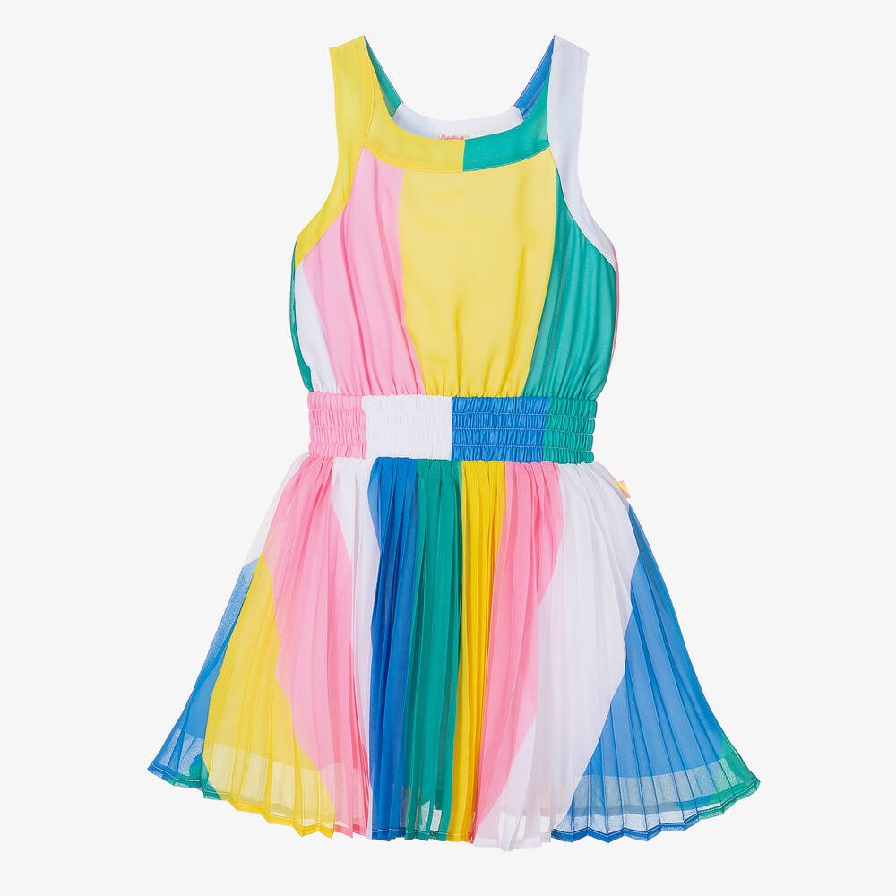 A bright and colourful dress for girls from Billieblush, striped in soft tones of pink, yellow, green and blue. Made in lightweight crêpe chiffon, this sleeveless style dress pulls on easily over the head and is fully lined for comfort. The wide, elasticated waistband gives a lovely feminine shape, with a finely pleated, full skirt adding a pretty, girly finish.