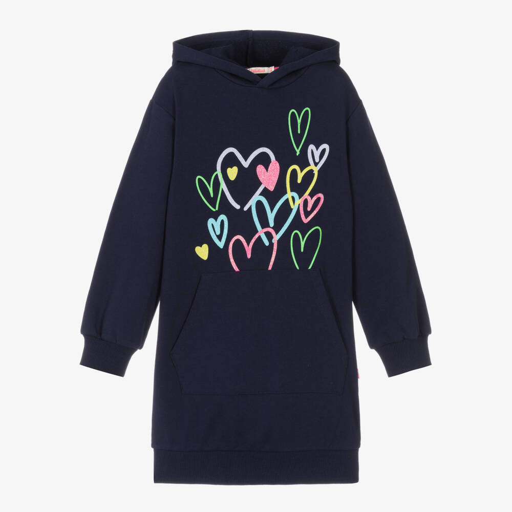 Stylish yet casual navy blue hooded dress for girls by Billieblush, made in soft cotton sweatshirt jersey. This easy-to-wear, slip on style has colourful glittery hearts printed on the front, with cosy ribbed trims and a useful pouch pocket on the front.
