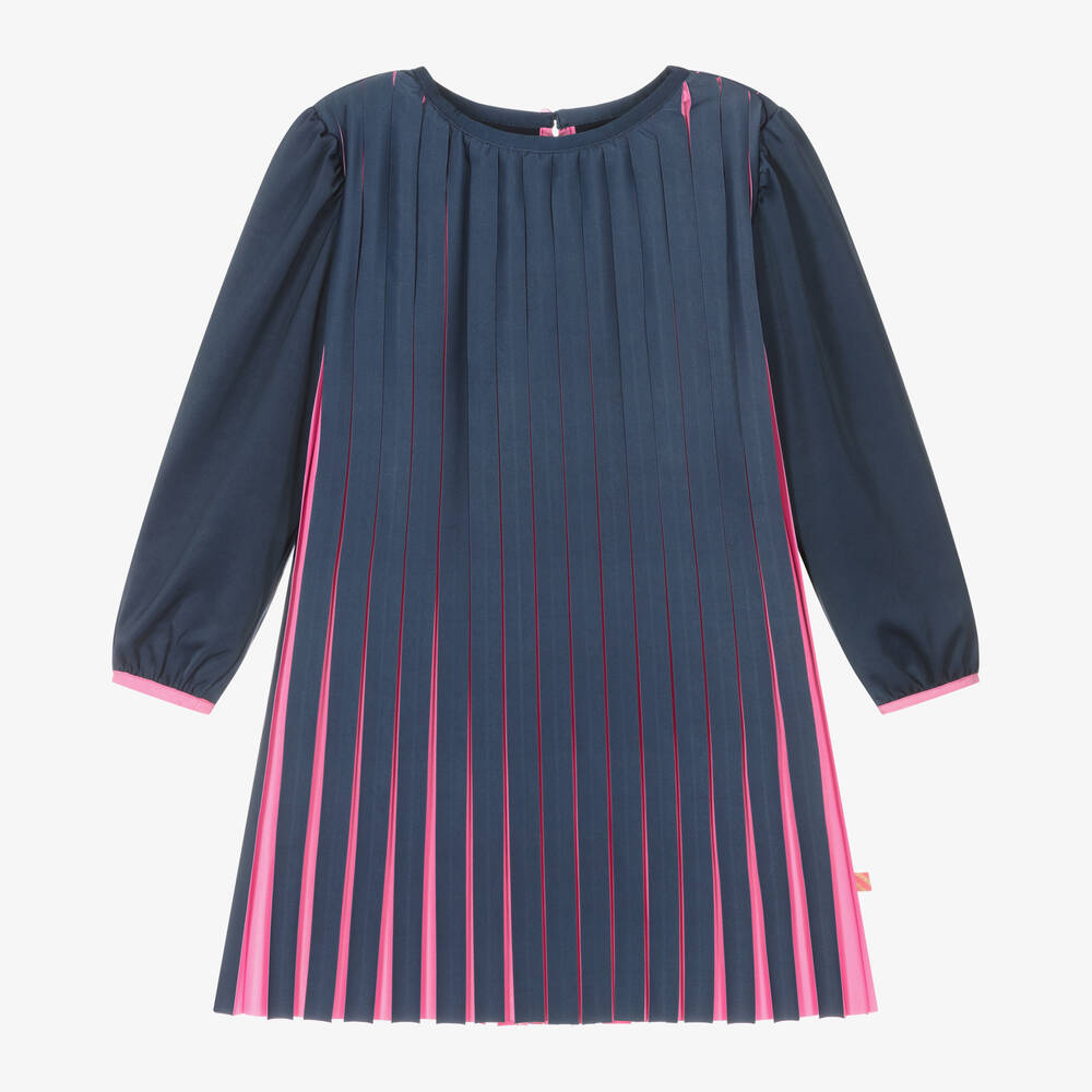 Smart navy blue satin dress for girls by Billieblush, with the brand's signature neon pink showing on the inside of the box pleats. Soft and silky, it has long, full sleeves, a logo tab on one side seam and a glittery pink keyhole button fastening on the back. The bodice is lined for comfort.