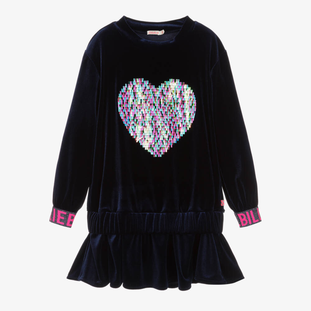 A stylish take on a sweatshirt dress for girls by Billieblush, made in soft, navy blue velour. Designed with the appearance of a two piece, the top has a glitzy sequin heart motif on the front and bright neon pink logo lettering on the shimmery elasticated cuffs. This easy-to-wear, slip-on style has a stylish dropped waist with a gathered skirt below for a casual, yet feminine, look.