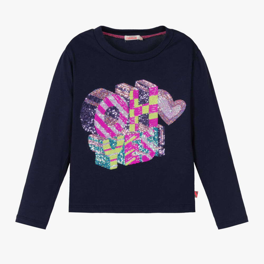 Eye-catching navy blue long sleeve top for girls by Billieblush. Fun and sparkly, the front has a sequined 'Oh Yes!' slogan in neon shades for extra good vibes. It is made in soft and stretchy cotton jersey with the neon pink striped logo tab on one side for a signature branding.