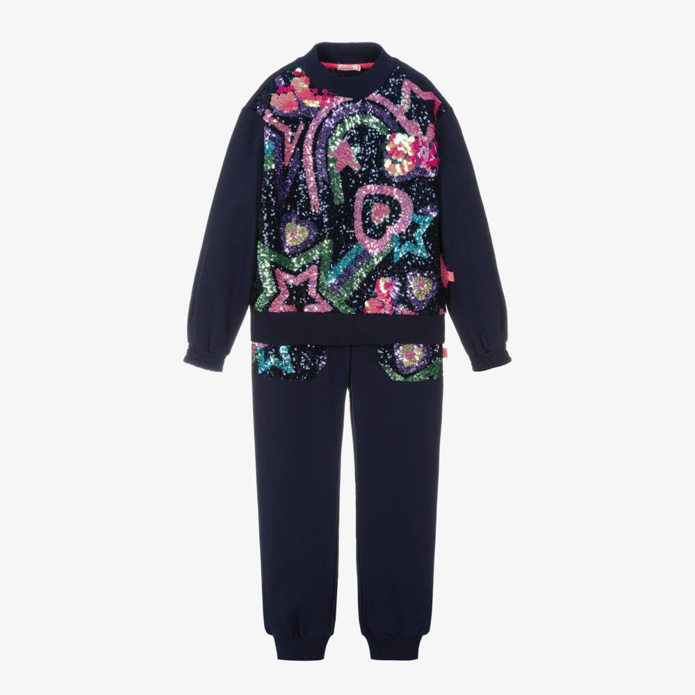 Glamorous navy blue tracksuit for girls by designer Billieblush, made in soft and stretchy sweatshirt jersey. Adding some sparkle to an everyday outfit, the comfortable top is patterned with sequined hearts and stars in pink, purple and green. The coordinating joggers have concealed side seam pockets with matching sequin patterns. The stretchy ribbed cuffs and gently elasticated waistband ensure a comfortable fit.